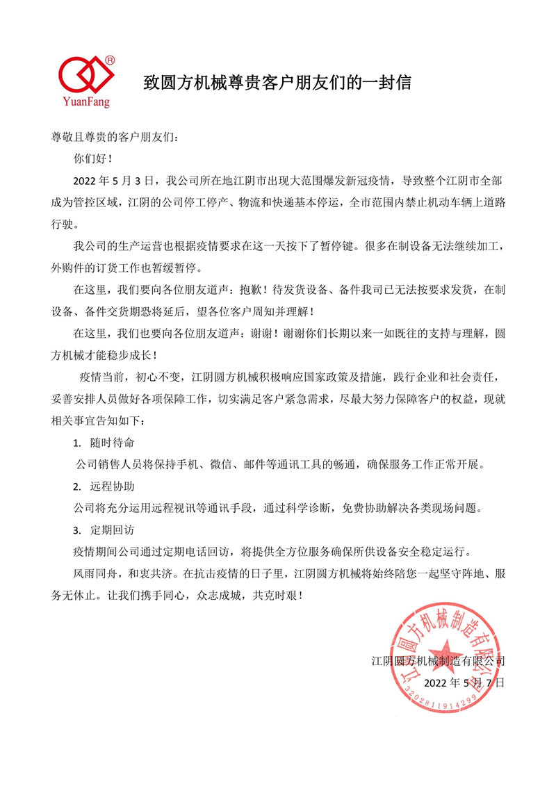 江陰圓方機(jī)械制造有限公司 地址:江蘇省江陰市南閘街道開泰路8號 聯(lián)系人:袁芳 13701523351 聯(lián)系人:沈經(jīng)理 13806160960 電話: 0510- 86282684 傳真:0510-86292857 Email:yfjx@yuanfangmach.com
